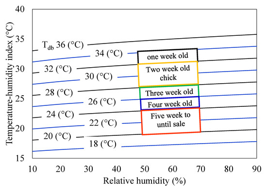 The temperature-humidity index (THI) is a linear combination of dry-bulb temperature and wet-bulb temperature. THI has been established to evaluate the effect of the thermal environment on thermoregulatory status of poultry birds [47]. Equation (16) governs THI for broilers [47].