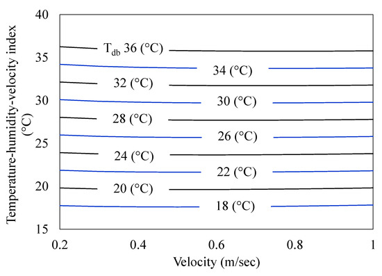 Figure 9 shows the relation of relative humidity and THI with reference to Tdb. Increase in humidity up to the optimal value of dry-bulb temperature works accordingly to overcome heat stress. Figure 10 represents the effect of Tdb on THVI with respect to varying air velocity. It is noticed that, at a fixed value of Tdb, THVI decreases slightly with an increase in the velocity of air. Moreover, Figure 11 shows THI with a varying temperature and relative humidity. THI ranges from 28 °C to 30 °C, which indicates an alarming situation for the poultry birds. It turns into a dangerous situation when THI surpasses 30 °C. An emergency action is required if the THI value surpasses 31 °C. Poultry birds grow healthier at 18 °C to 29 °C and 50% RH [47].