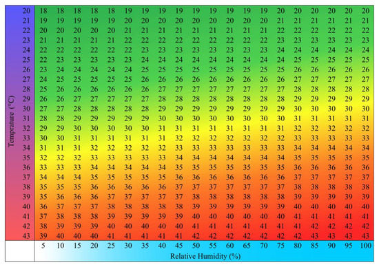 The numerical values of THI corresponding to various temperature and relative humidity levels. The green color presents relatively better THI whereas a red color reflects the worst scenario of THI.