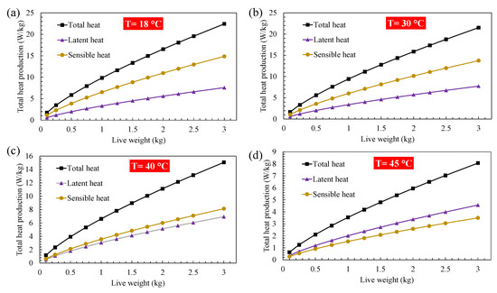 The sensible and latent heat production per poultry bird for (a) 18 °C, (b) 30 °C, (c) 40 °C, and (d) 45 °C.