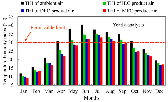 Annual profile of THI resulting from the EC systems for climatic conditions of Multan. The red dotted line shows the optimum level of THI i.e., 30.