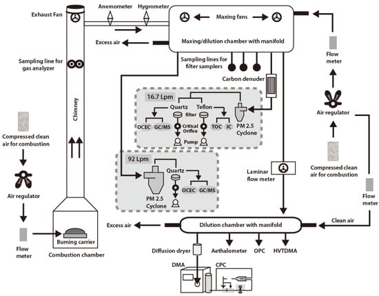 A biomass burning chamber consists of three parts (i.e., a combustion chamber (0.54 m3), primary dilution chamber (3.75 m3) and secondary dilution chamber (0.04 m3)). It was employed for generation of forest tree types (6) and agricultural crop residues (4) (Figure 1 and Table 1), which were sampled from rural and regional forest areas in Korea. Zero air was supplied into the combustion chamber using a mass flow controller. About 25 g of biomass for each combustion was loaded on the grid of the combustion stove. The smoke was drawn into a primary (3.75 m3) dilution chamber (1:1), followed by a secondary dilution chamber (0.04 m3) (1:10). PM2.5 samples were collected on pre-baked 90-mm quartz-fiber filters, 47-mm quartz-fiber filters and 47-mm Teflon filters (Pall Gellman, Ann Arbor, MI, USA) using 92 L per minute (lpm) medium-volume sampler and a set of low volume samplers, respectively. The detailed operation conditions can be found at the previous publication [26].