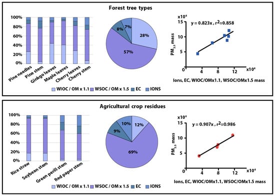 Relative chemical abundances in PM2.5 and scatterplots between measured and reconstructed PM2.5 mass from burning of forest tree types and agricultural crop residues byproducts.