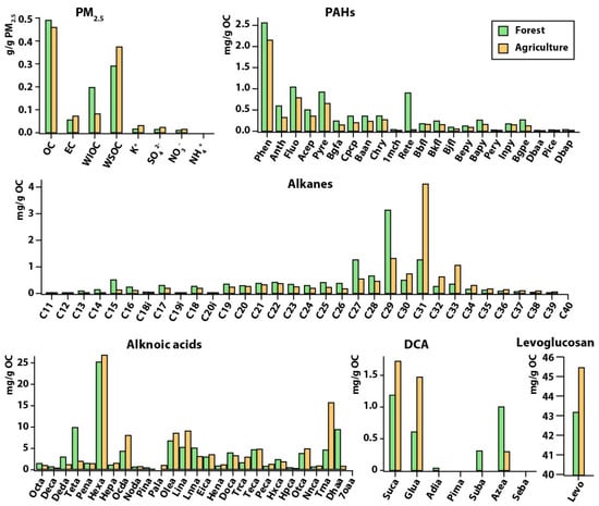 Comparison of concentrations of the main components of PM2.5 from forest burning and agriculture burning.