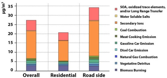 The CMB model (EPA-CMB8.2) was applied to the results obtained during the intensive sampling campaign [32,33]. The CMB develops a solution based on a linear summation of products at a receptor location based on the abundance of source profiles and source contributions. The CMB model attempts to fit ambient speciated results from residential and roadside sites to a specified group of sources with corresponding molecular markers. In this study, uncertainties for CMB in molecular marker data points were defined as the maximum of two functions of spike recoveries, detection limits, and load blank standard deviations. The source profiles used in the study except the biomass burning is the profiles in the previous study [28]. The detailed CMB method can be found elsewhere [28].