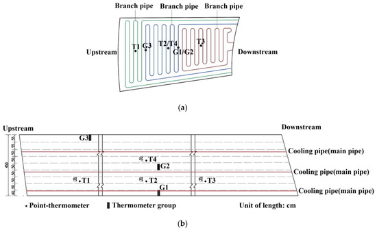 Embedded positions of thermometers and cooling pipes: (a) layout of thermometers and branch pipes; (b) vertical distribution of thermometers and main pipes.