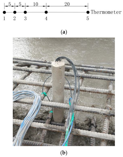 Arrangement of the thermometer string: (a) spacing of thermometers (cm); (b) concrete column.