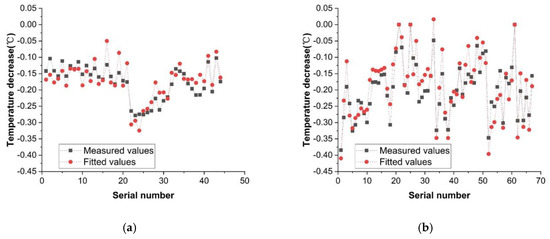 Comparisons of the measured and fitted values of the temperature decrease for the two dams: (a) Baihetan dam and (b) Wudongde dam.