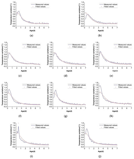 Comparisons of fitted and measured temperature variations for Wudongde dam: (a–j) the fitted and measured results of the ten selected concrete blocks, respectively.