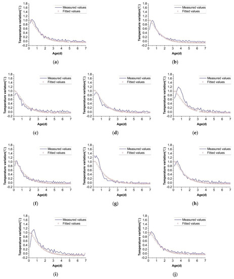 Comparisons of fitted and measured temperature variations for Baihetan dam: (a–j) the fitted and measured results of the ten selected concrete blocks, respectively.