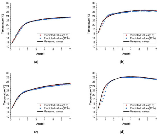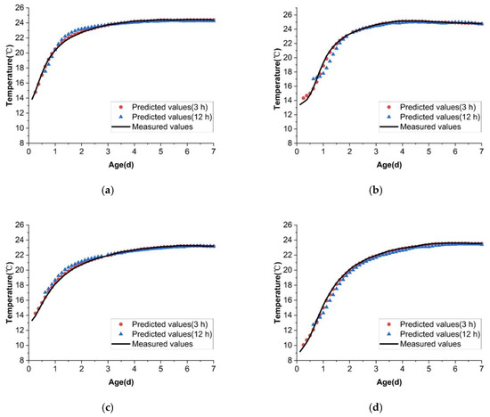 In light of the in situ monitoring data collected from main pipe (1) and G1, as shown in Figure 4, after the start of water supply, the time for each thermometer in G1 affected by the cooling pipe decreased as distance increased, and the response time of the cooling effect of the thermometers located in the middle of the two cooling pipes with a vertical space of 1.5 m was about 3 h. Therefore, the temperature at 3 h after the current time could be calculated using the cooling water data within the last 3 h. To verify the accuracy of the prediction model, the actual cooling water data were regarded as known variables. Using the data of the remaining four concrete blocks from the two dams, temperatures at 3 and 12 h were calculated and compared with the measured values, as depicted in Figure 7 and Figure 8. Equation (2) takes into account the influence of concrete temperature, therefore, the method of superimposing the calculation according to the time period was used to reduce the error caused by excessive change in the temperature of the concrete during the calculation period. The temperature was predicted after 12 h by splitting 12 h into four 3 h parts, that is, the procedure to predict the temperature was repeated four times every 3 hours, with the results of the previous prediction used in the next calculation.