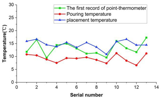 Owing to large forecasting errors existing in the initial stage, it was necessary to explore the main factors affecting the concrete temperature during this period. Data regarding the pouring temperature and placement temperature of the concrete were analyzed. In this study, the pouring temperature was the concrete temperature at 10 cm below the concrete surface after the concrete was put down and before vibration, whereas the placement temperature was the concrete temperature at 10 cm below the concrete surface after the concrete was vibrated and before the new concrete was covered. The first records regarding thirteen point-thermometers and the average pouring temperature and placement temperature in the same concrete layer are presented in Figure 9, showing that the initial records of the point-thermometers were basically between the pouring temperature and placement temperature. This indicated that the initial recording time of the point-thermometer was usually after the concrete was put down and before it was vibrated. Figure 9 also shows that the placement temperature was higher than the pouring temperature; the difference between these two temperatures was named the pouring temperature rise (PTR). The magnitude of the PTR may be related to both the environment and the hydration heat of concrete, and the duration of the heat exchange between the concrete and the external environment was related to the construction speed. However, the construction speed fluctuated within a certain range; under this condition, the main influencing factors of the PTR could be obtained based on a large amount of data.