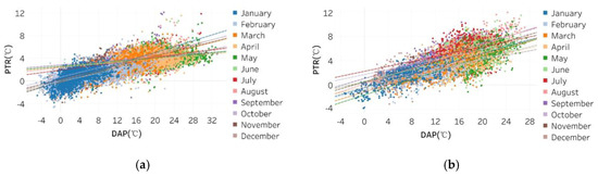 This study collected all relevant data from the Baihetan and Wudongde dams since construction started. The relationship between the PTR and the difference between air temperature and pouring temperature (DAP) is plotted in Figure 10, showing that the relationships for both dams are basically linear, thereby verifying the previous speculation of the influence of ambient temperature. Meanwhile, Figure 10 displays the trend line of each month, and the slopes of these trend lines are also plotted in Figure 11.