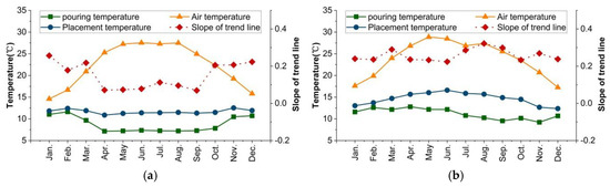 Figure 10a and Figure 11a show that the slope of the trend line for each month for Baihetan dam is divided into two sides. The slopes of the trend lines from April to September are relatively small, but are larger from October to March of the following year, following the variation law of hot and cold seasons. Figure 11a presents the monthly averages of the related temperature data during the concreting of Baihetan dam, showing that the pouring temperature of Baihetan dam was strictly controlled according to the season. From April to September, pouring temperature was low and air temperature was high; consequently, PTR was large, but the slope of the trend line was relatively small. This situation was reversed from October to March of the following year. Compared with Baihetan dam, the relevant data of Wudongde dam are irregular, as shown in Figure 10b and Figure 11b; the pouring temperature of Wudongde dam was not strictly controlled according to the season, and the slopes of the trend lines do not change according to season. Ultimately, no correlation between the slope of the trend line and pouring temperature was observed.