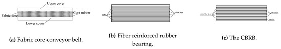 The conveyor belt is a common industrial belt used to carry and transport materials, composed generally of four parts: skeleton (fabric core), core rubber, upper and lower cover [28] (Figure 2a). The core of the fabric conveyor belt is mainly formed by alternate fiber layers and core rubber layers. There are usually four to six fabric fiber layers in the conveyor belt, and its material is generally nylon, polyester, aramid, etc. Unlike the previous fiber-reinforced rubber bearing [3,4,5,6,7,8,9,10,11,12,13,14,15,16,17,18,19,20,21,22,23,24,25,26], which is made of a fiber layer and a rubber layer laminated at a fixed interval (Figure 2b), the fabric core conveyor belt rubber bearing (CBRB) proposed in this paper (Figure 2c) is formed by directly stacking and bonding the fabric core conveyor belt with appropriate adhesive.