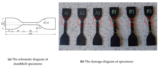 The dumbbell specimens. (a) The schematic diagram of dumbbell specimens; (b) the damage diagram of specimens.
