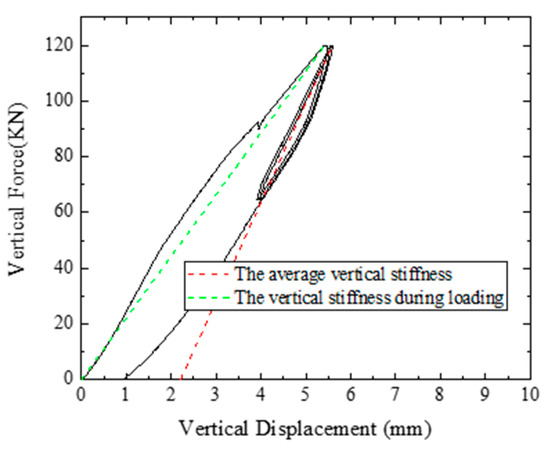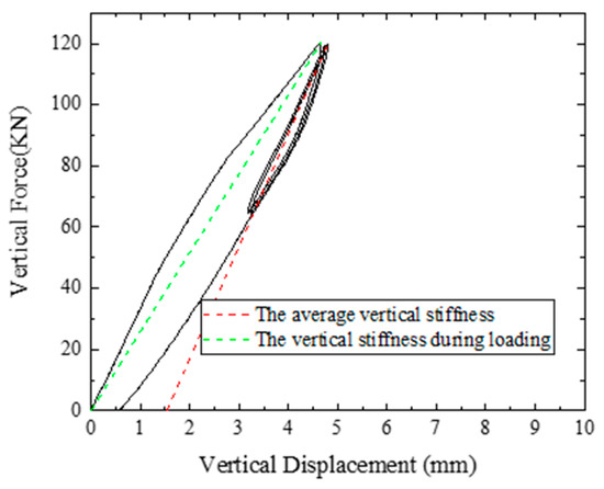 The vertical stiffness Kv of the bearing and the equivalent damping ratio ζv,eq are calculated according to the following two equations. In the two formulas, Y2 and Y1 are horizontal maximum positive and negative displacement; F2 and F1 are horizontal shear force corresponding to Y2 and Y1, and ΔW is the envelope area of the hysteresis curve.