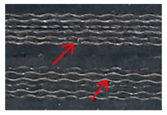 As can be seen from Figure 7, Figure 8, Figure 9 and Figure 10, the bearings exhibit certain damping characteristics in the compression test, and the results show that the slope of the green secant in the loading stage is less than the slope of the red secant in the subsequent unloading stage, because of the so called run-in effect. The most likely reason of the effect is that the fiber fabrics are not straightened (as shown in Figure 11) during the manufacturing process of the conveyor belt, which means that the fiber fabrics cannot begin to limit the deformation of the rubber until they have been straightened by applying a certain vertical load [31]. In addition, in Figure 9, when the curve is at the beginning of the loading phase, the slope of the curve is significantly smaller than those of the other three bearings, which shows that there is a gap compaction process of the bearing, and also explains the residual displacement of R3 is larger than those of the other three bearings.