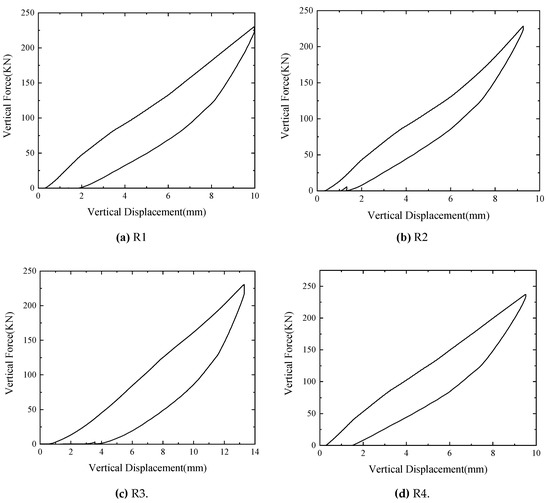 In this test, the vertical pressure of the four bearings is all loaded to 10 MPa, no visible interlayer splitting and pressure failure of the bearings was observed, and the corresponding overpressure force-displacement curves are shown in Figure 12.