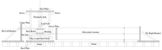 The setup used in the horizontal shear test is shown in Figure 13. The main structure of the test setup is fixed on the base by four screws with a diameter of 30 mm. A vertical hydraulic jack is equipped to provide the vertical force with force control, and the load cells under the jack is used to measure the force. The horizontal loading system is performed as displacement control, and the displacement is applied by the hydraulic actuator. The bearing was located between the upper plate and the low plate. The upper plate is fixed by the left bracket, and the lower plate is attached to the horizontal actuator, which is fixed by the right bracket. Three steel rollers with a diameter of 20 mm are placed between the lower plate and the pad. During the test, it is necessary to ensure that the steel roller and the pad are smooth enough, and the dust on the pad should be cleaned in time.