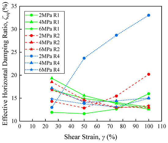 As can be seen from Figure 19, the effective horizontal stiffness of the bearings decreases with increasing shear strain. In addition, the curves under a constant vertical pressure of 2 MPa (marked by circle) further decrease significantly, due to sliding of the bearing after the shear strain exceeding 50%. However, the reduction is not noticeable for the pressure of 4 MPa or 6 MPa (marked by triangle and pentagram, respectively). The effective horizontal stiffness of R2 increases with the increase of vertical pressure. When the vertical pressure of 4 MPa is applied, as the number of fabric layer increases, the effective horizontal stiffness of bearings also increases. Under the other two pressure levels, the above-mentioned conclusions cannot be obtained, and we will further study the specific reasons in the future research. As can be seen from Figure 20, when the shear strain is within 50%, its equivalent damping ratio decreases with increasing shear strain; as the shear strain is greater than 50%, its equivalent damping ratio changes without obvious rules, but the fluctuation is not large. However, the sliding of the bearing causes the effective horizontal damping ratio increase with increasing shear strain. In general, the effective horizontal damping ratio of this new type of bearings is about 15% without considering the sliding of the bearing.