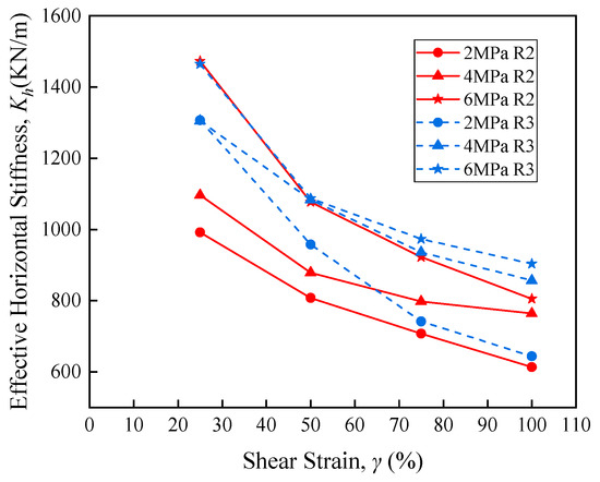 Figure 21 and Figure 22 show the horizontal equivalent stiffness and the effective damping ratio of R2 and R3 at different shear strains and pressure levels. The legends in Figure 21 and Figure 22 have the same meaning as that in Figure 19 and Figure 20.