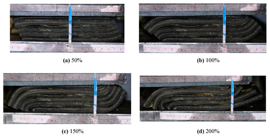 After the horizontal compression-shear tests, the ultimate compression-shear test under a constant vertical pressure of 6 MPa was carried out on the bearing R1. Figure 23 shows the photographs of R1 taken from cyclic testing at different shear strains (γ = 50%, 100%, 150% and 200%). As the shear strain increased, the misalignment between the adjacent conveyor belts inside the bearing was obvious, and the bonding strength of the adhesive used for attaching gradually failed, until the test was terminated. When the shear strain is 150%, the side faces of the bearing were almost completely in contact with the upper and lower plates, and the interlayer dislocation was already obvious; when the second circle with 200% shear strain was applied, the restoring force of the bearing dropped by more than 20%, and the test was terminated. As can be seen from Figure 23, the quality of the cohesive is the key factor controlling the ultimate shear performance of this type of bearing.