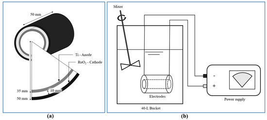 To generate electrochemically-produced chlorine, two cylindrical electrodes were used in this study (Figure 1). A RuO2 electrode was used as an outer cathode and a Ti electrode was used as an inner anode. The RuO2 and Ti electrodes had diameters of 100 and 70 mm, respectively. Both electrodes were 5 mm thick and 50 mm long as shown in Figure 1a. To quantify the amount of free chlorine produced by the RuO2/Ti electrodes, an experiment was performed using the West Sea water. First, 20 L seawater were placed in a 40 L bucket as shown in Figure 1b. The RuO2/Ti electrodes were then installed in the middle of the bucket. Four different electric currents (i.e., 10, 15, 20, and 25 A) supplied by a direct current (DC) power supply (TDP-3030B, Toyotech Co., Incheon, Korea) were tested. While the current was supplied to the electrodes, the seawater was completely mixed using an agitator. Water samples were collected from the bucket at a given time interval.