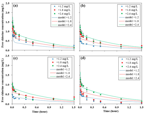 Free chlorine decay curves in seawater with different TOC and initial chlorine concentration. Each line represents the predicted concentration of chlorine under a given condition. (a) Artificial seawater solution with 1 mg L−1 of TOC; (b) artificial seawater solution with 2 mg L−1 of TOC; (c) artificial seawater solution with 3 mg L−1 of TOC; (d) West Sea water (1.3 mg L−1 of TOC).
