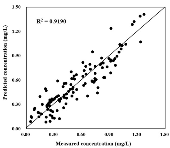 The injected chlorine decayed rapidly within one minute and then decayed more gradually, as shown in Figure 3. Although there are some small variations between the predicted and measured data, the model describes the chlorine decay in seawater well. The correlation between the model and experimental data is depicted in Figure 4; the coefficient of determination (R2) was 0.919.