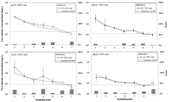 Free chlorine distribution along the sampling ports under different flow rates. Each dot represents experimental data, and each point on the black line is the expected chlorine concentration obtained from computational fluid dynamics (CFD) simulation with a parallel first-order decay model. The red-dotted line is the desirable concentration at the given flow rate: (a) 600 L min−1 of flow rate, (b) 700 L min−1 of flow rate, (c) 800 L min−1 of flow rate, (d) 900 L min−1 of flow rate.