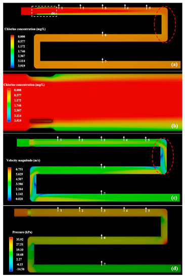 The in-situ electro-chlorination results are shown in Figure 6. The measured chlorine concentration at each sampling point and the calculated concentration obtained via the CFD simulation were compared under different flow rates. In both cases, model calculated values reasonably followed the measured ones. The chlorine concentrations gradually decreased due to the diffusion while the water passed through the first pipe containing sampling ports 1–5. After that, the concentrations remained relatively stable through the second and third pipes (which correspond to sampling ports 6 to 7) because the chlorine became fully mixed with the seawater when it passed through the pipes bent at 180° (circled with a red-dotted line in Figure 7). This phenomenon is more marked in the simulated results due to experimental error. The red-dotted line in Figure 6 represents the desirable concentration. As expected, the chlorine concentrations near the wall remained higher than the artificial concentration prior to ports 6 and 7. This chlorine dispersion is clearly shown in the simulation. Figure 7 shows three types of fluid contours, chlorine concentration (Figure 7a,b), velocity magnitude (Figure 7c), and pressure (Figure 7d). As shown in Figure 7a,b, the generated chlorine flowed along the pipe and gradually diffused through seawater. Thus, chlorine concentrations can vary throughout the length of the pipe, as is further discussed in Section 3.3.