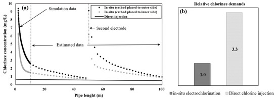 For the case of direct chlorine injection, it was assumed the chlorine is uniformly distributed when injected into the pipeline due to a limitation on defining chlorine injection method. For in-situ electro-chlorination, a series of electrodes were assumed. The chlorine concentration was estimated based on the simulated results of the first 10 m because of the cost limitations associated with a full-scale simulation. Figure 9a compares the chlorine concentration along the surface of the pipe between the cases of in-situ electro-chlorination and direct chlorine injection. After passing through the first 50 m of pipe, the chlorine concentration of the in-situ case was reduced to 0.5 mg L−1 mainly due to diffusion. As a result, the second electrode should be installed at 50 m apart within such a system. On the other hand, the chlorine concentration of the direct injection case in which water mixed well with chlorine was stable around 0.65 mg L−1, which was expected to be lower than 0.5 mg L−1 at the end of the pipe due to chlorine decay. Figure 9b presents the relative chlorine demands of each case. It was estimated that in-situ electro-chlorination would demand only 1/3 of chlorine dose that is required by the direct chlorine injection, even though in-situ electro-chlorination could generate higher chlorine concentrations along the surface of the pipes (exceeding 0.5 mg L−1) (Figure 9a).