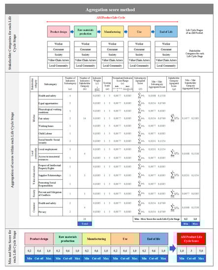In order to aggregate the different scores, it is necessary to use a mathematical method. In [18] an aggregation method was developed to conduct a social assessment of the Indian steel sector. They assign equal weights to each indicator, facilitating indicator normalization. In order to normalize an indicator, after multiplying the indicator score by the indicator weight, it is necessary to divide the obtained value by the maximum score value that can be assigned to an indicator. The normalized scores are then aggregated within each life cycle stage by summing up the scores of their respective stakeholder categories. In this way, a score between 0.20 and 1 is assigned to each life cycle stage. The final score of the product’s social impact is equal to the summation of all the life cycle stage scores, which is between 1 and 5. The structure of the aggregation method developed in the present study follows the method introduced by [18] and is illustrated in Figure 2. The method is comprised of the following steps: