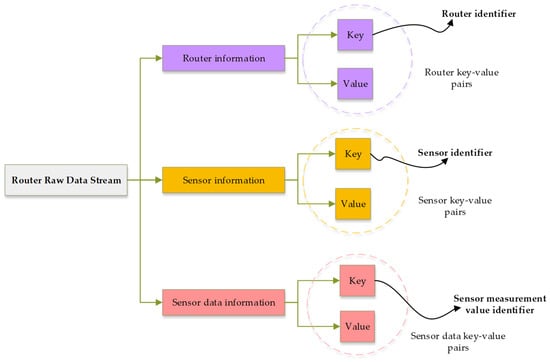 According to this pattern, sensor measurement value can be formulated as RID:1; SID:1; WH:45. This means that the value 45% of weather humidity is measured by the sensor numbered 1, which is plugged to router 1. Figure 2 illustrates how to decompose sensor raw data stream. DDE decomposes the raw sensor data and extracts router definitions, sensor definitions and sensors’ measurement values from this data.