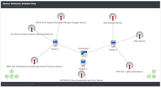 Coordinators and their routers are illustrated on maps on open-data platforms according to their latitude and longitude information. Platform users can access the detailed information of WSNs by following the link on coordinator tooltips. Each one of the sensors, routers and coordinators can be visualized as hierarchical nodes on the platform; and platform users can access sensors’ data, which are measured in the last five minutes and visualized in appropriate graphs by using clickable features of the routers’ icons. Figure 3 shows how each component of WSN is viewed on the open-data platform.