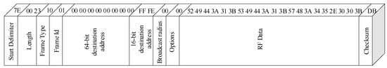 XBee module, which supports multiple protocols, is highly configurable and consists of small radio frequency (RF) devices that transmit and receive data over air using radio signals [62]. It was used to transmit data wirelessly between routers and the coordinator. Each XBee device is configured as Application Programming Interface (API) mode within the built WSN. There exist several reasons behind preferring API mode. API operating mode eases managing transmission of data towards multiple destinations. Each received data contains the address of the sender device. This mode provides advanced Zigbee addressing, advanced networking diagnostics and remote configuration [63]. XBee devices, which are configured as API operating mode, uses API frame illustrated in Figure 4 to transmit data from routers towards the coordinator. After router devices measured environmental data through their sensors, they transform the sensor measurement values to API data frame using relevant Arduino libraries.