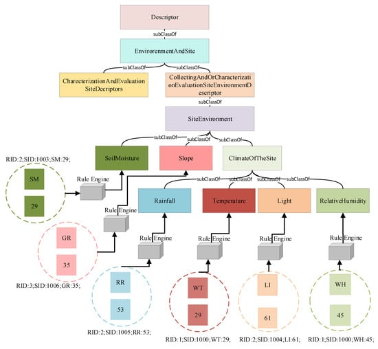 SIL plays an important role in the data integration process of the proposed approach. All considerable procedures for data integration such as executing SPARQL queries, applying mapping rules, making data interchange and storing mapped data within varied file formats are carried out within this layer. Crop-specific trait ontologies have also a very critical role in the subcomponent named data interchange engine of SIL. It uses crop-specific trait ontologies to map sensor measurement values to relevant traits of agricultural products for publishing more annotated data through open-data platforms for usage of any domain stakeholders. Domain experts may create these mapping rules by selecting relevant ontology classes and mapping them to corresponding sensor measurement values. Mapping rules are also used to link data obtained from IoT devices with agricultural ontology classes. They can be stored in RDF format and implemented by retrieving and manipulating with SPARQL to perform interchange operations when needed. Semantic web technologies are an important way of revealing the common knowledge of a particular domain by performing reasoning procedures [48]. Discovering information in RDF datasets is performed using simple protocol and RDF query language (SPARQL); and the result of the relevant SPARQL query is formed as RDF triples [49]. The inference rules can be defined by domain stakeholders via the relevant module of the platform, which is represented on Figure A3 to help managing knowledge in the context of agriculture. These rules assist with domain stakeholders’ understanding of the true meaning of sensor measurement values to perform more precise agricultural activities.