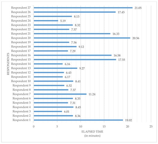 In this evaluation process, the following modules were evaluated: (i) “Ontology viewing and loading” represented on Figure A1; (ii) “Selecting individuals of traits for inference rules creation” represented on Figure A2; (iii) “Creating rules definitions for individuals” represented on Figure A3; (iv) “Creating mapping rules” represented on Figure A4; (v) “Wireless sensor networks management” represented on Figure A5; (vi) “Charting and managing mapped sensor measurements” represented on Figure A6. The following tasks were assigned to each respondent to complete: register to the platform; login to the platform; access the UI of ontology viewing; access the UI of creation of mapping rules; select the individuals of traits for creating inference rules; access the UI of creating rules definitions for selected individuals; save defined rules for each selected individual; access the UI of WSN lists, select the relevant WSN and access the list of its routers and coordinators; select any sensor of router and access the UI of visualizing collected data on the charts; access the UI of listing mapped sensor data. Each respondent completed all assigned tasks to him/her successfully. While each respondent was performing the tasks, he/she recorded the elapsed time. Figure 7 shows the time spent by each respondent in completing her/his tasks. From Figure 7 one concludes that the average elapsed time is about 10.44 min. Considering the results, the most spent time for completing entire tasks is 21.05 min and the least spent time is 5.19 min.