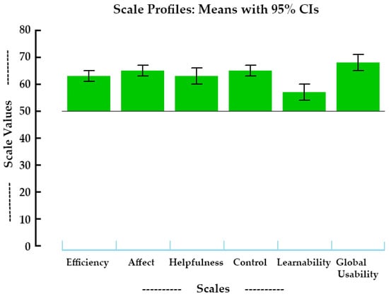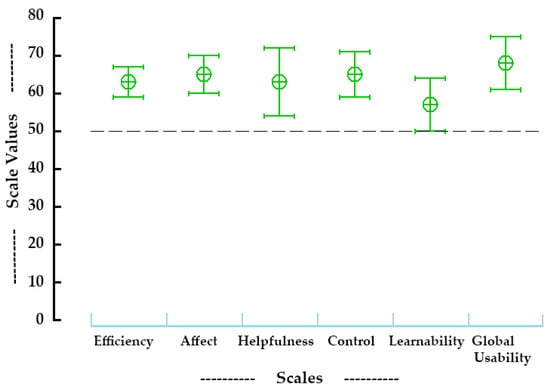 The software usability measurement inventory (SUMI), which is a rigorously tested and proven method of measuring software quality from the end user’s point of view [65], was used to measure the usability of the open-data platform. Figure 8 reveals that there were satisfactory results of the entire scales. It also shows the range of the 95% confidence interval of the means of the scales.