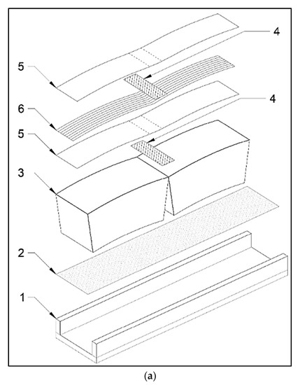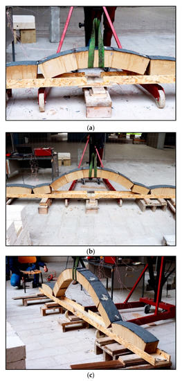 A masonry curved member is generally composed of a group of stone blocks, placed side by side on a wooden shape-imposed support (i.e., centering), which is removed after the member geometry is completed. In order to properly produce the shape of the centering, mortar-based joints are generally modeled in between two adjacent stone blocks. Alternatively, the procedure illustrated in Figure 1 (related to the case of an arch) can be executed: the blocks are aligned on the floor; a tensile-resistant material is bonded to the blocks, and finally, the middle block is lifted up. The use of Fiber-Reinforced Polymer (FRP) is adequate for joining the blocks [21,22]. In order to facilitate the relative rotation between two adjacent blocks, the polymeric matrix is applied discontinuously: the area of contact between the blocks is resin-free in order to develop a hinge. To this part, butyl tape is applied on the contact line before the resin wet lay-up and removed when the FRP is placed on the extrados. The key-block (i.e., the central block) lifting produces sliding of the other blocks on the base support. In order to allow as much horizontal movement as possible, the MylarTM sheet is interposed between them to limit the friction. The technique proposed in this paper consists of a Hinged Lifting Arch (HLA). The lift should be carefully performed in correspondence with the middle-line of the key-stone to avoid extreme in-plane rotation of the suspended body that can imply undesired overturning and consequent collapse of the HLA. In this way, the construction is time- and cost-efficient and FRP-strengthened.