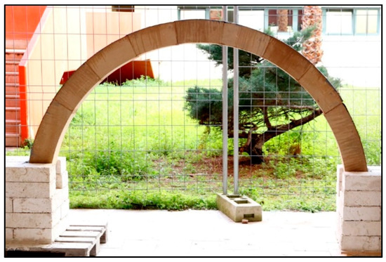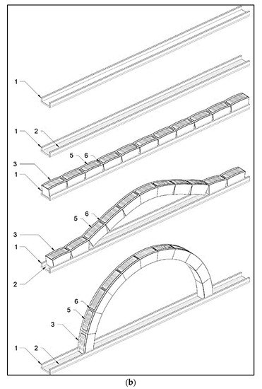 The masonry arch was a typical construction technique for roofing systems before the use of iron and other modern materials. It was used in the past, especially in the Mediterranean, because of its architectural value and its static carrying capacity, in addition to thermal inertia and fire resistance [1,2,3]. Despite these significant advantages, new curved members are constructed less frequently due to the disadvantages associated with construction technology when compared to modern materials. In fact, the construction of curved members requires the building of scaffolding, namely, centering. Large structures, such as vaults and domes, require huge and complex centering (made from steel or timber). As a consequence, the cost and time required for manpower and design are relevant. Moreover, the on-site risks related to materials falling from above or workers falling have to be carefully considered. A crucial case is the construction of a bridge arch above a river or cliff. Finally, seismic vulnerability is another limit of curved masonry structures [4,5].