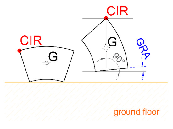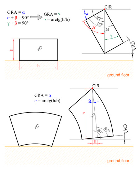 This section aims to report a design-oriented model for the geometry of the HLA. In the absence of external force, a suspended body reaches a stable equilibrium depending on the gravity force. The rotation can be defined by the GRA, which strongly correlates with the aspect ratio (length over width) of the body itself. For this reason, the relationship between GRA and lm/s was investigated, and results are reported in Figure 4, where lm is the length of the middle line of each block, and s is the width of the block. Demonstrably, when an annular section segment is lifted up, as illustrated in Figure 4, the GRA is the same as the angle reached by an Equivalent Rectangle (ER). The segment connecting the CIR and the intercept with the horizontal (passing through G)—b—is the first side of the ER. The segment connecting the intercept of the horizontal axis with the normal line to the free face of the block, passing through CIR—h—is the second side of the ER.