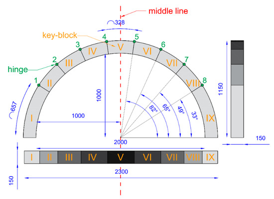 According to the model proposed in Figure 6, a combined solution between b and c was assumed, as illustrated in Figure 7, in order to build a first experimental prototype. In fact, a total of nine blocks (I–IX) and eight hinges (1–8) were necessary to reach a semi-circle shape. In particular, seven blocks were identical (i.e., II–VIII) with an extrados length equal to 328 mm from α ≥ 33° (solution c), while two base blocks (I and IX) were almost double-length (i.e., 657 mm) according to solution b. Both the thickness and the width of the arch were 150 mm, and the total span was 2000 mm long.