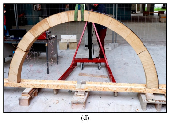 Progress of the lifting: (a) 3 voussoirs lifted; (b) 5 voussoirs lifted; (c) lateral view and (d) full-lifted arch.