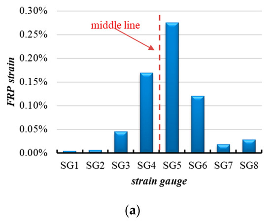 After lifting, the acquired data were processed. In particular, the FRP strains were related to the position of the SGs (see the Figure 13a), or rather to the key-block lift (see the Figure 13b). It can be noticed that the lifting was not symmetric; in fact, the histogram shows different tensile strain between left and right blocks with respect to the middle-line. This phenomenon was due to the incorrect positioning of the harness. In the authors’ opinion, the issue may be solved by lifting at three points (e.g., in blocks IV, V, and VI).