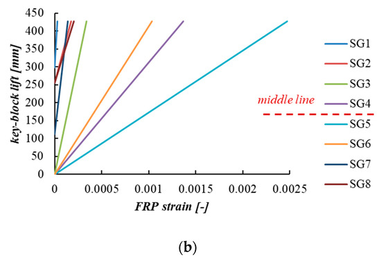 Data elaboration: (a) symmetry level of the lifting and (b) FRP-strains with respect to the lift of the key-block.