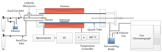 Figure 1 shows the AMPCVD, as well as the optical detection for emission spectroscopy measurements and exhaust gas detection devices. The 200 W atmospheric pressure 2.45 GHz microwave plasma generator includes a solid-state microwave source, a coaxial plasma generator, and a gas control system. The coaxial microwave plasma generator consists of two copper tubes. The diameters of the central and outer tubes are 6 and 20 mm, respectively, and their length is 90 mm. Through the center tunnel, a mixture of Ar gas and ethanol vapor is pumped into the plasma. H2 gas fills the space between the center and outer tubes for shaping the plasma. The solid-state microwave source provides a stable 200 W microwave power for the generator to produce atmospheric pressure plasma. The gas control system includes three mass flowmeters to give an axial gas and a swirling gas to sustain the plasma flame.
