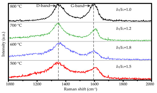 Figure 4. Raman spectra of the samples obtained at 500, 600, 700, and 800 °C on the substrate.