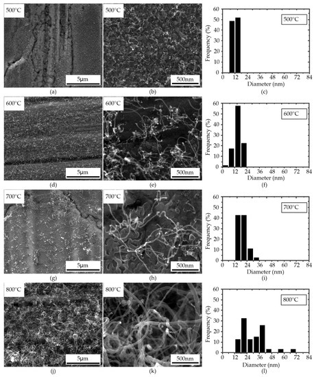 Figure 5 shows the SEM micrographs and the diameter distribution of the CNTs grown on the substrate with 200 sccm ethanol precursors at the temperature of 500, 600, 700, and 800 °C. The CNTs synthesized on the stainless steel substrate lie on the substrate face, with disordered orientation and uniform distribution, consistent with the results reported in the literature [19,21], which use stainless steel substrate to grow CNTs by CVD and PECVD. It is proved that the morphology of CNTs is caused by the stainless-steel substrate. Figure 5a,d,g,j and 5b,e,h,k is the low magnification and high magnification images of the CNTs grown at the temperature of 500, 600, 700, and 800 °C, respectively. The total mass of CNTs increased with the increase of the temperature at the range of 500–800 °C. When the temperature is 800 °C, the total mass of CNTs is 300 mg. The carbon content of the total ethanol precursor is about 312 mg, indicating that approximately 96% of the precursor converted into CNTs. The precursor conversion efficiency at 500, 600, 700, and 800 °C was calculated, and they are 2%, 17%, 42%, and 96%, respectively. In the temperature range of 700–800 °C, the conversion efficiency of precursor increases significantly, indicating that the most suitable temperature for the growth of CNTs should be in the range of 700–800 °C; this needs further research.